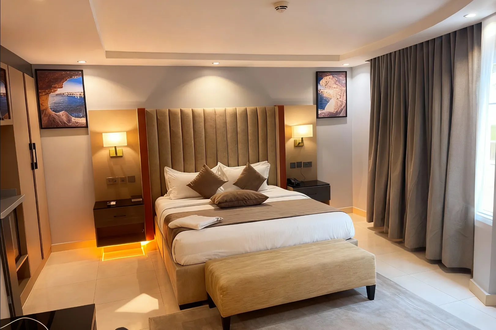 The Standard Room at Villa Park Hotel Abuja offers a blend of modern comfort and understated elegance. Designed with the business and leisure traveler in mind, the room features a plush king-size bed with premium linens and soft pillows, complemented by a sleek upholstered headboard. Warm lighting and earth-tone décor create a serene, relaxing ambiance, while blackout curtains ensure complete privacy and rest.